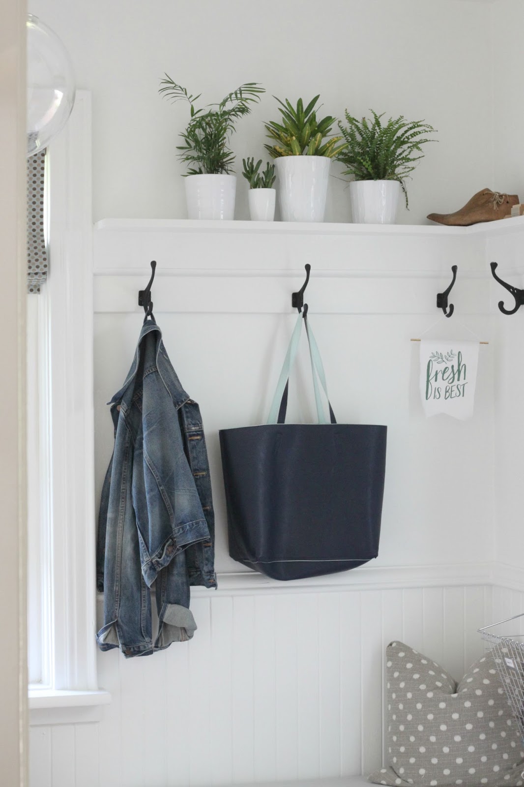 To start, only the coats that we are currently wearing on a regular basis are kept at the back. In the summer, this means there is very little hung on the hooks. In the fall and winter, this is a different story for sure. I try to ensure that our everyday jackets are there but our nicer coats that we wear less frequently are hung in the front entrance, out of sight. My purse and school bag also find a spot on these hooks.